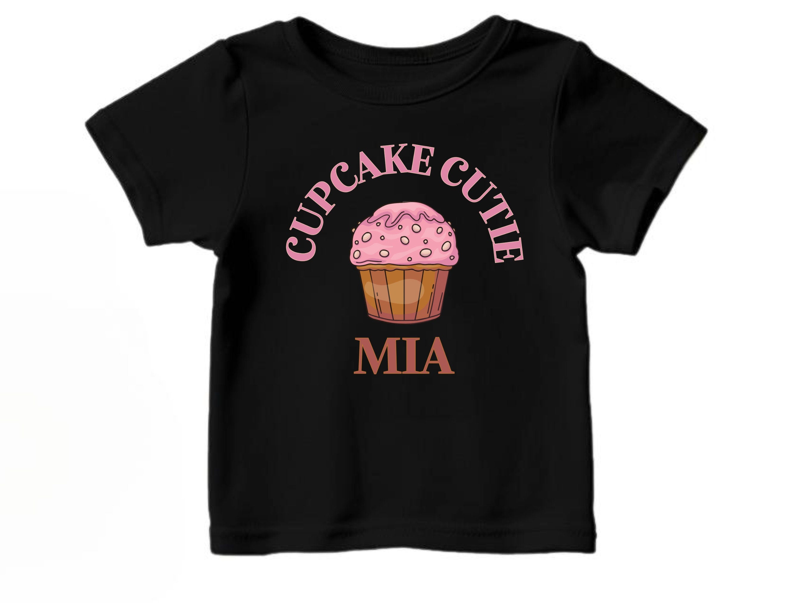 a baby sitting on the ground wearing a black shirt with a cupcake cutie