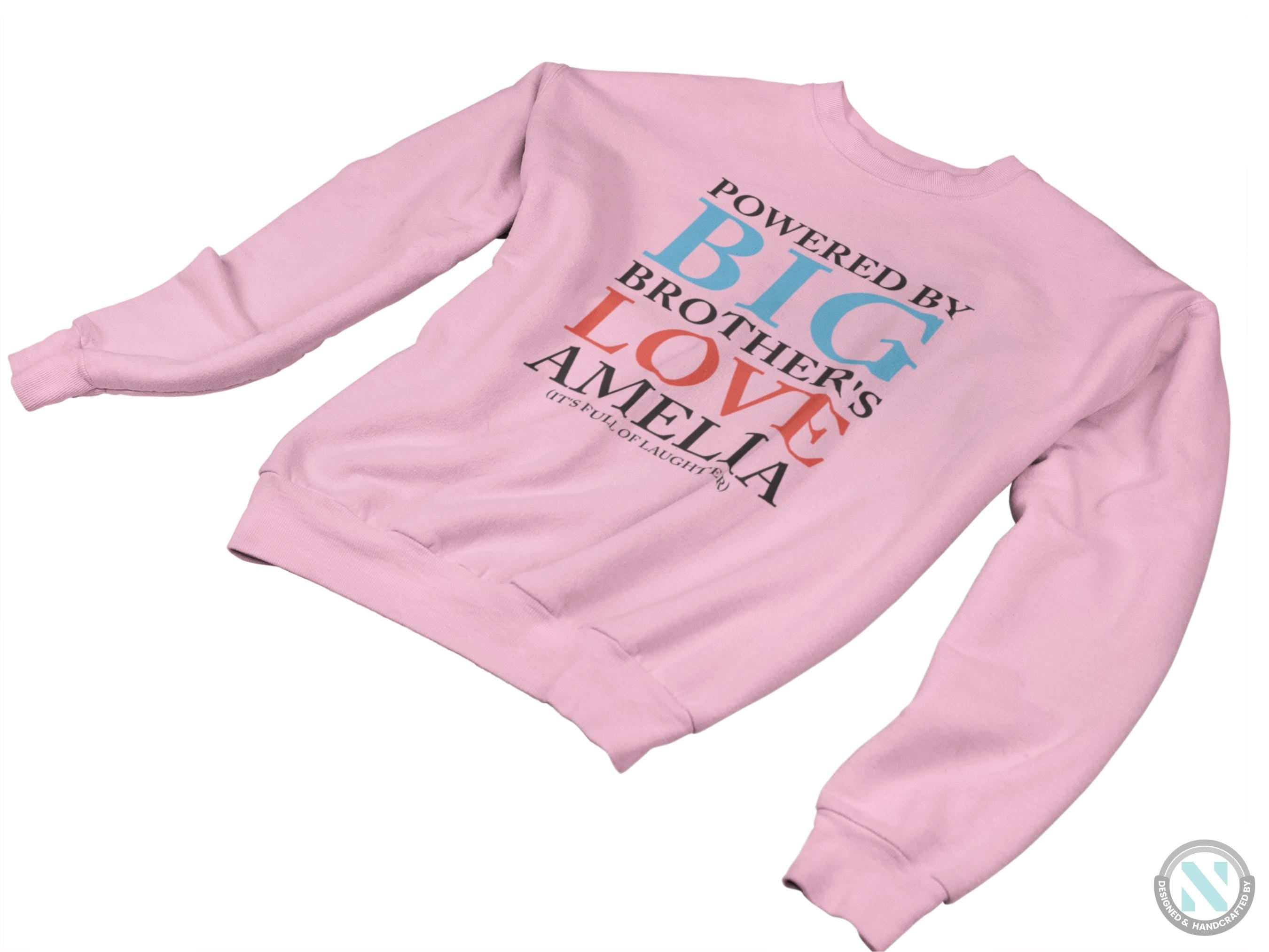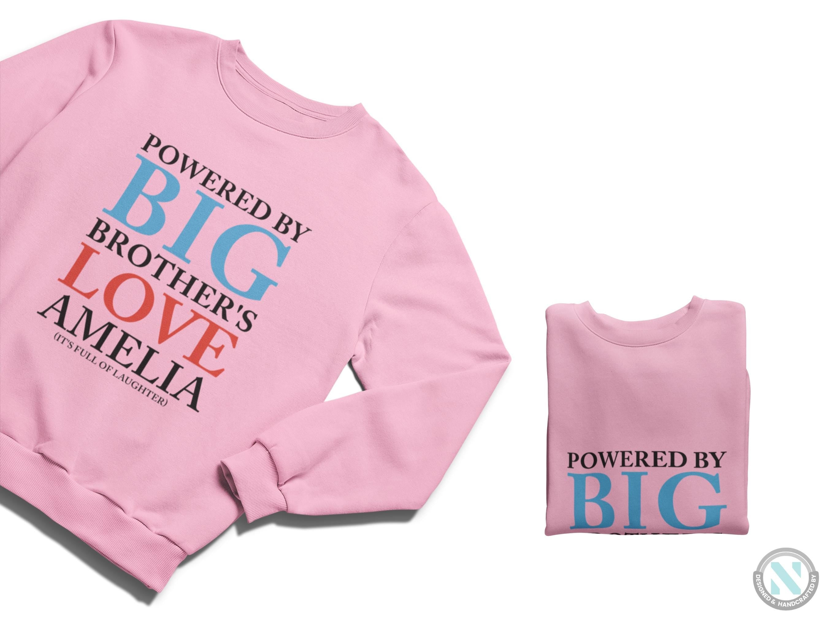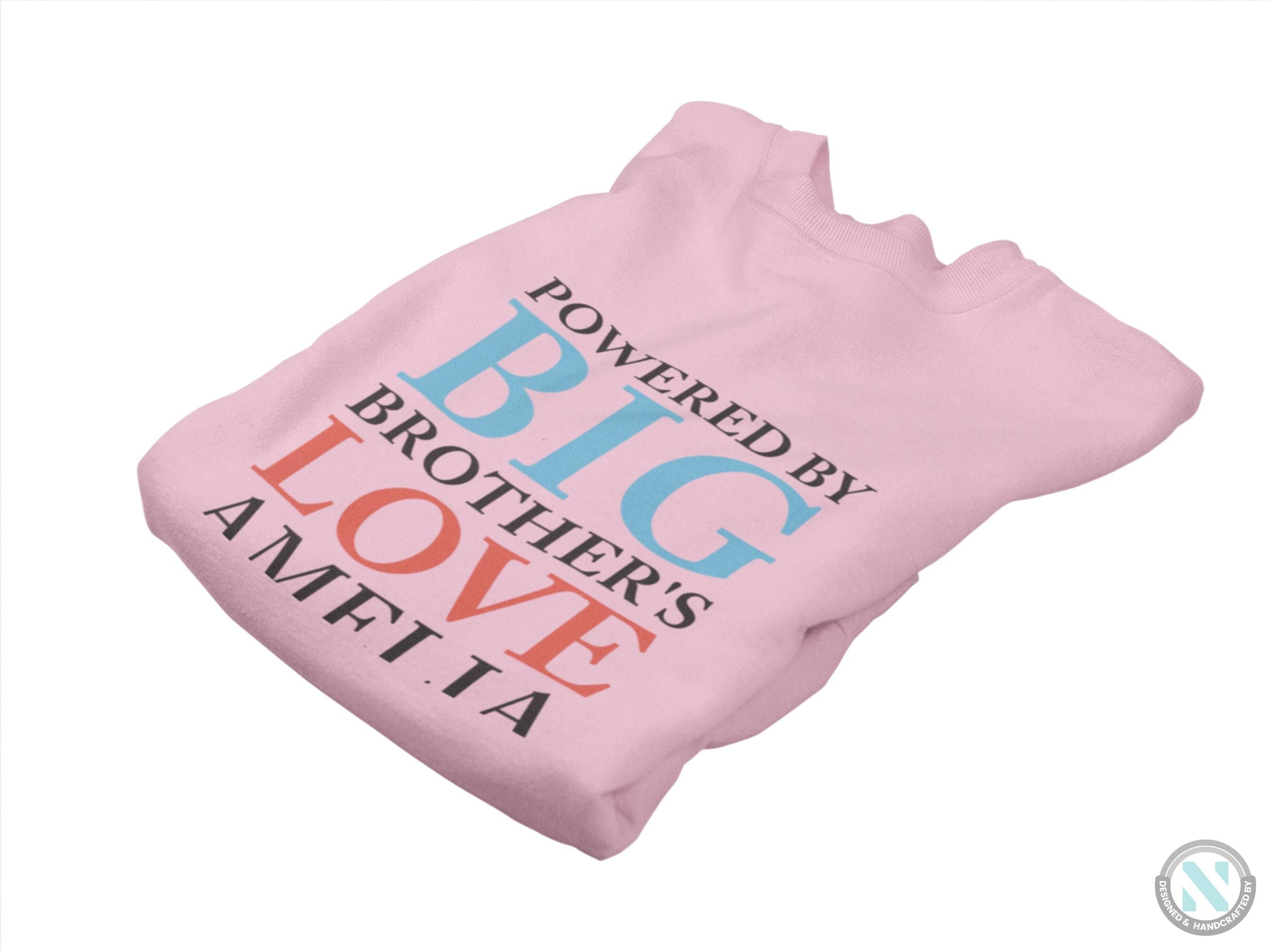 a pink sweatshirt with the words, powered by big brother's love ameli
