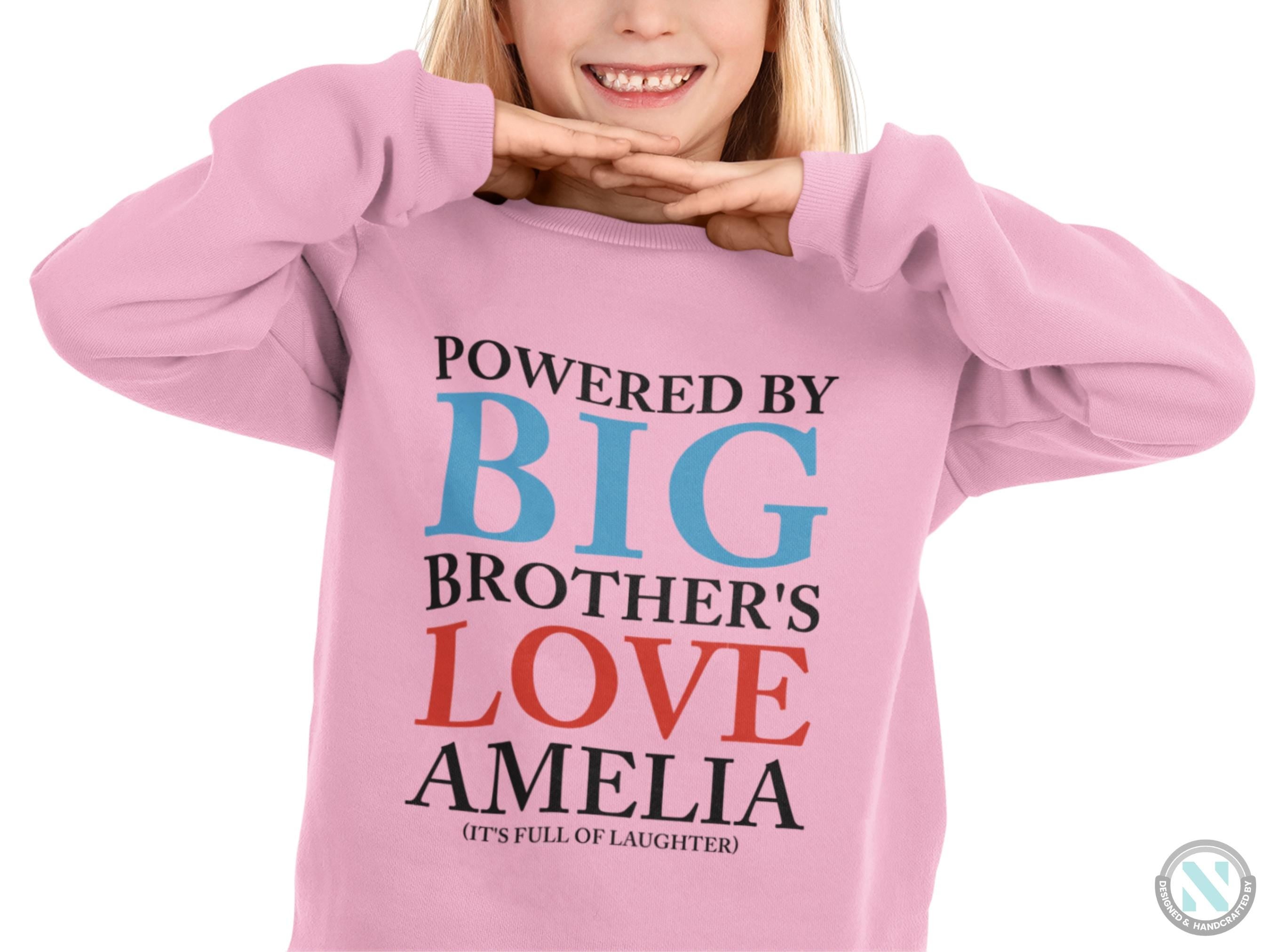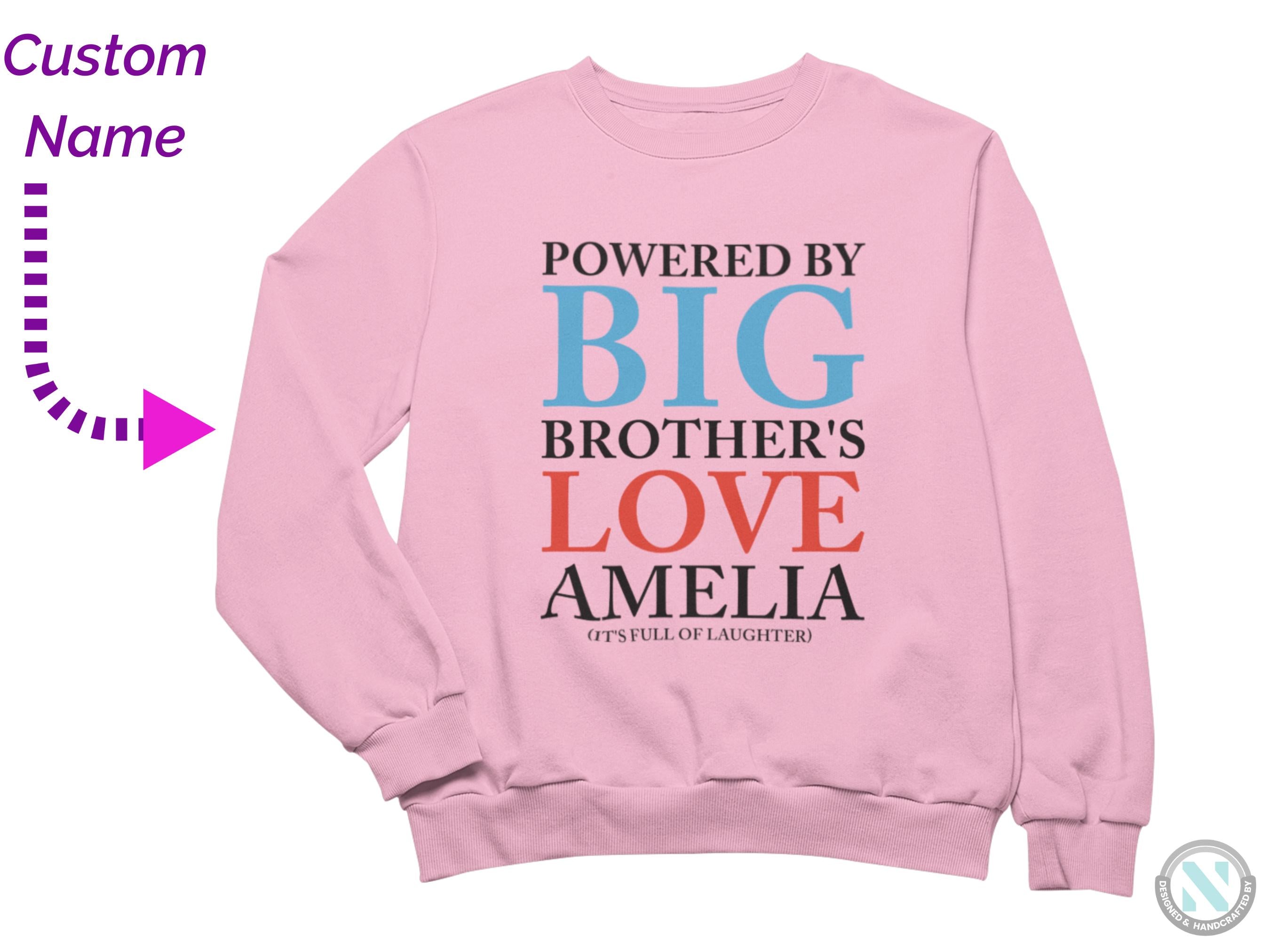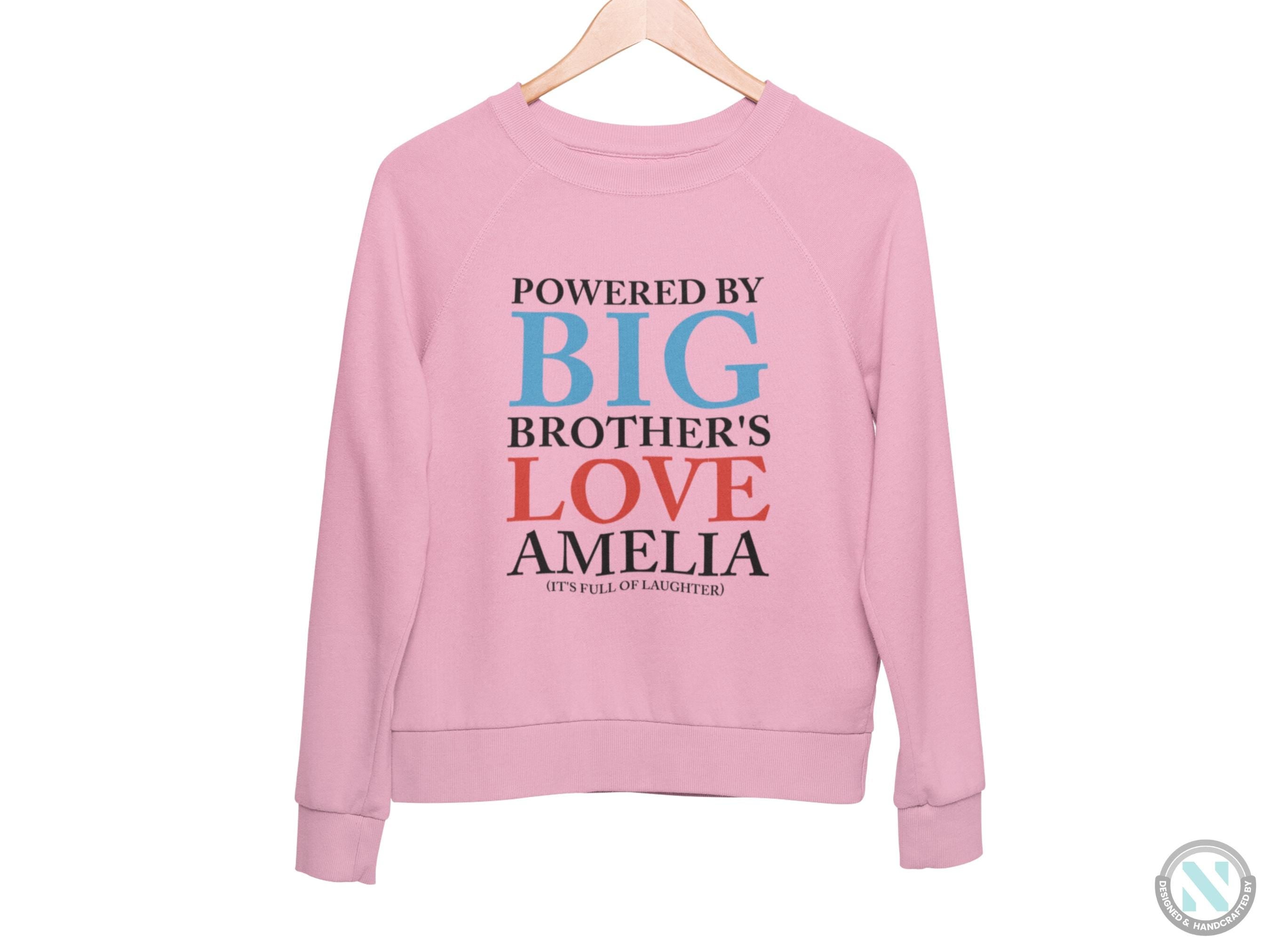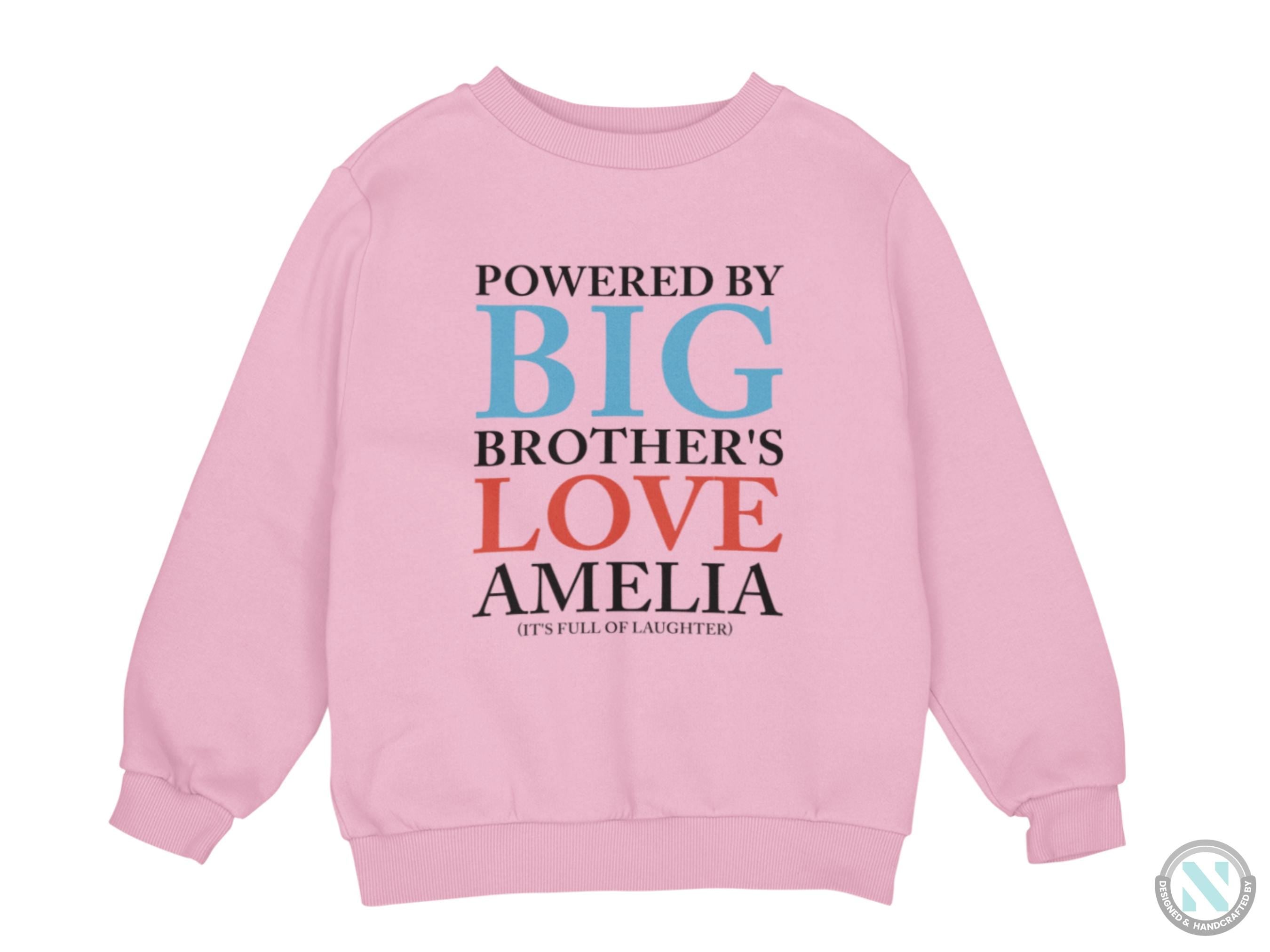 a pink sweatshirt with the words, powered by big brother's love ameli