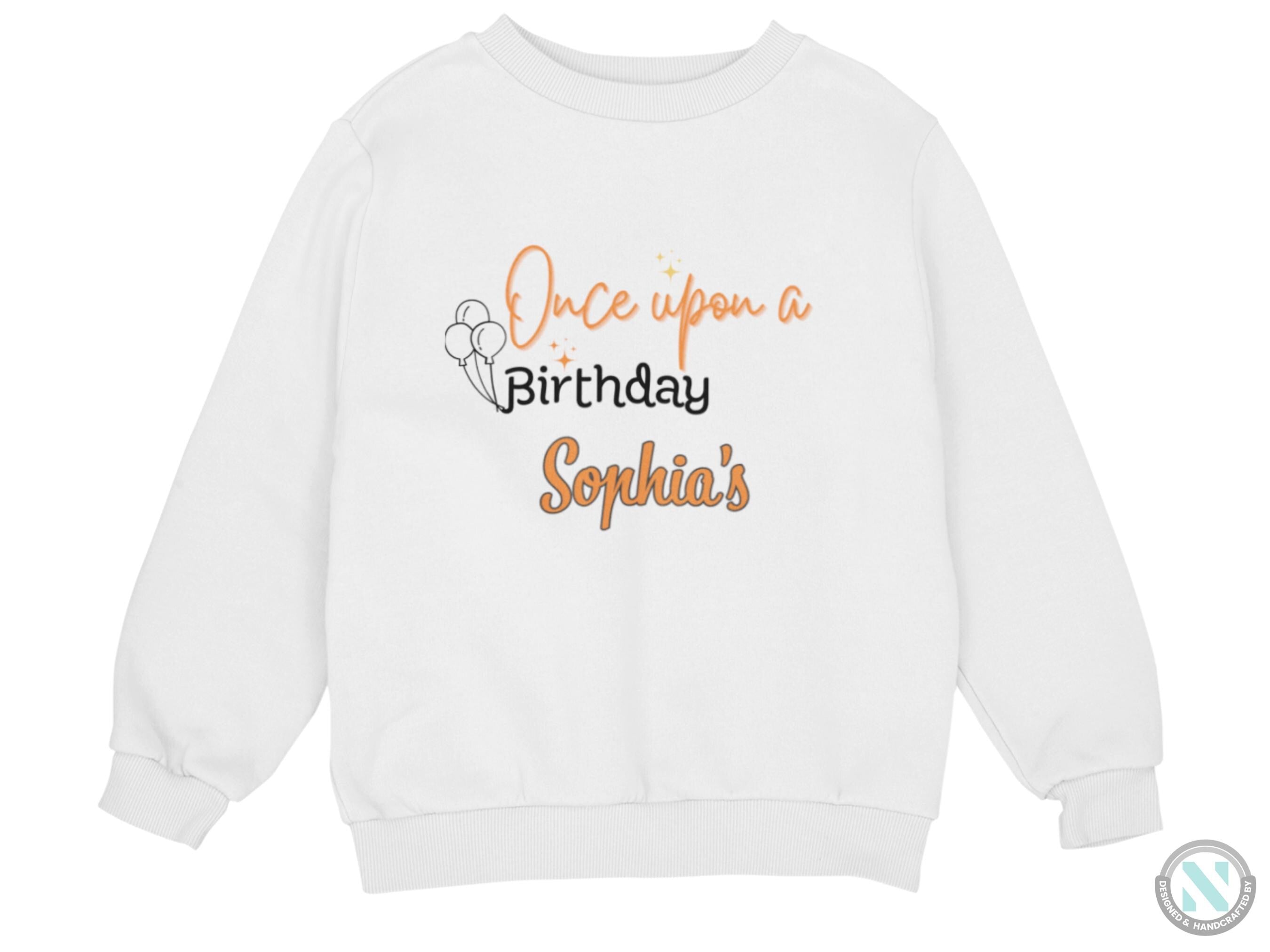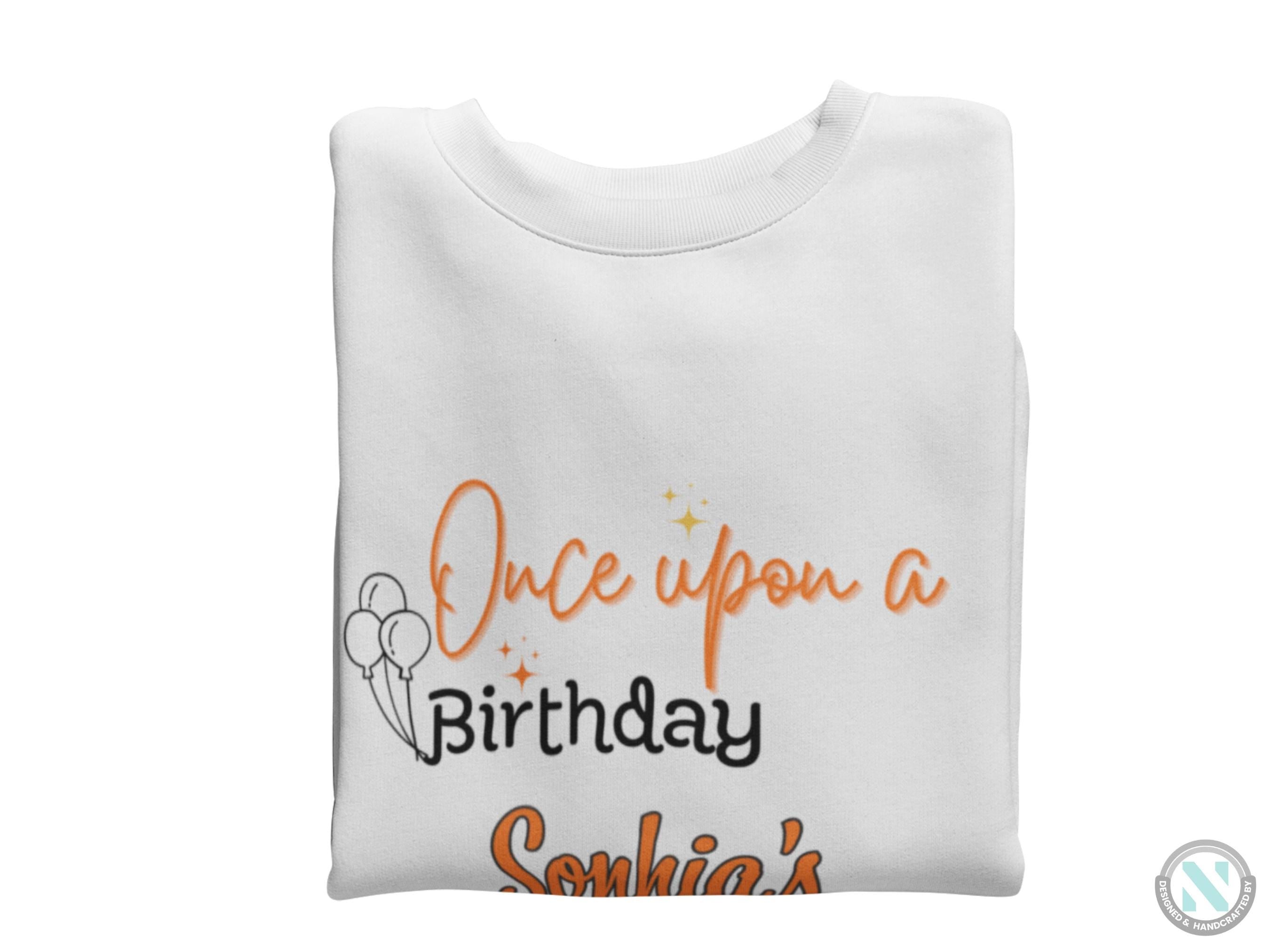 Celebrate your little girl's special day with the enchanting "Custom Birthday Sweatshirt with Once Upon a Birthday" for Toddler Girls. This Personalized Jumperd sweatshirt isn't just clothing—it's a magical gift that encapsulates the wonder and joy of her birthday celebration, making it the perfect choice for a memorable birthday gift.