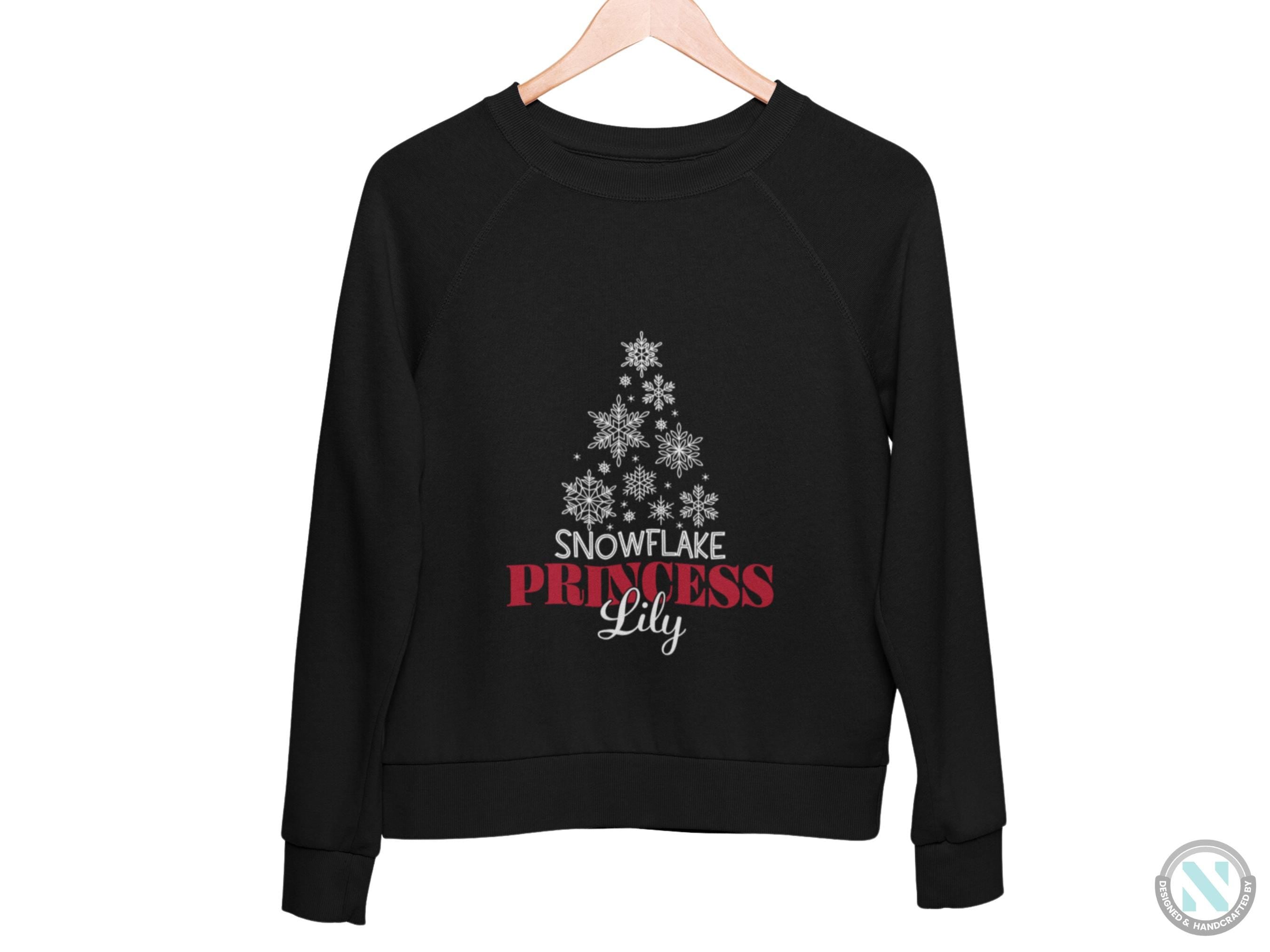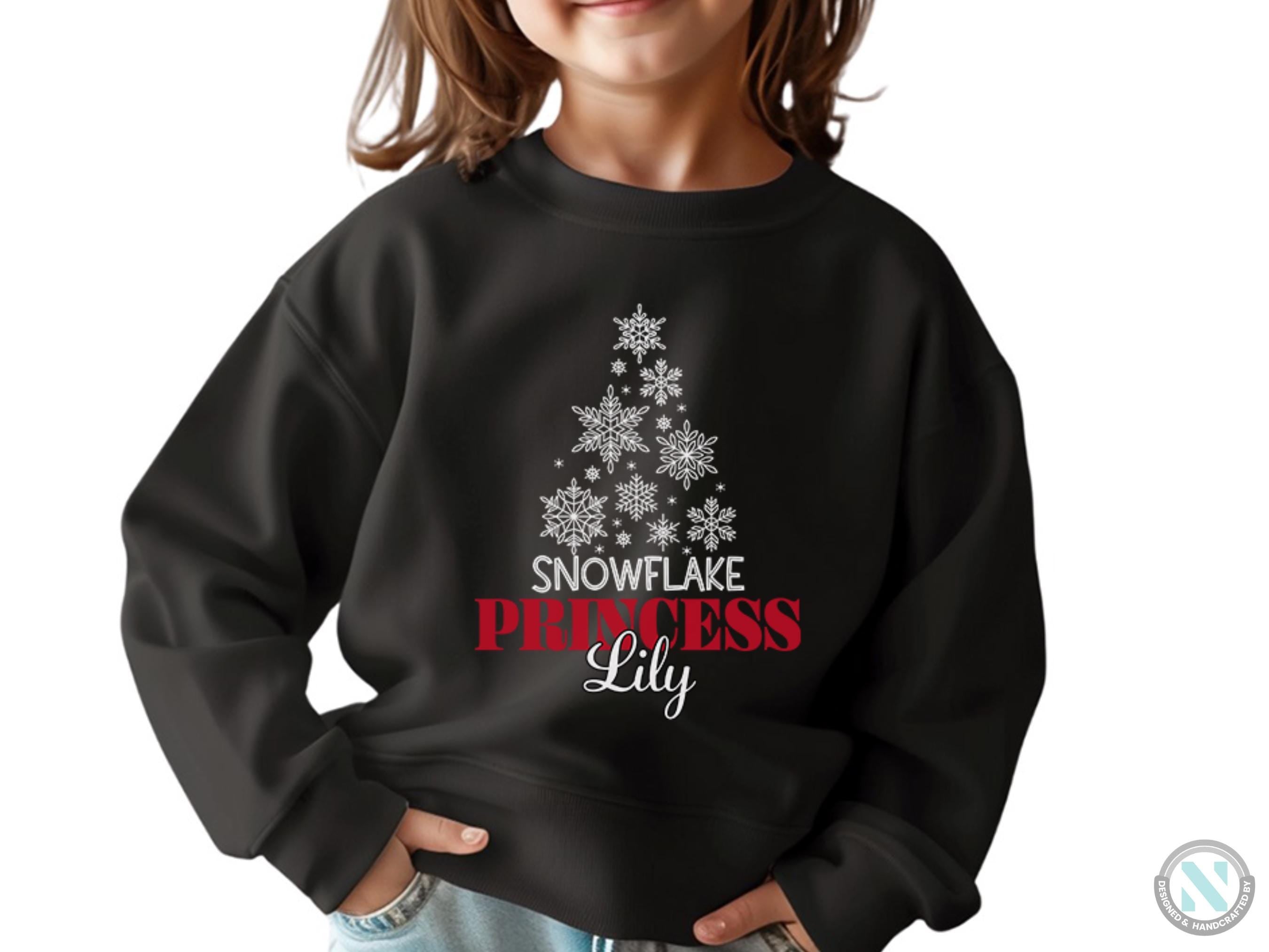 Transform your little one into a holiday princess with our "Custom Snowflake Princess Girls Christmas Sweatshirt." This Personalized Jumperd name winter sweatshirt is the perfect addition to your child's Christmas wardrobe, making it an ideal Xmas Kids Jumper gift that combines festive elegance and cozy comfort.