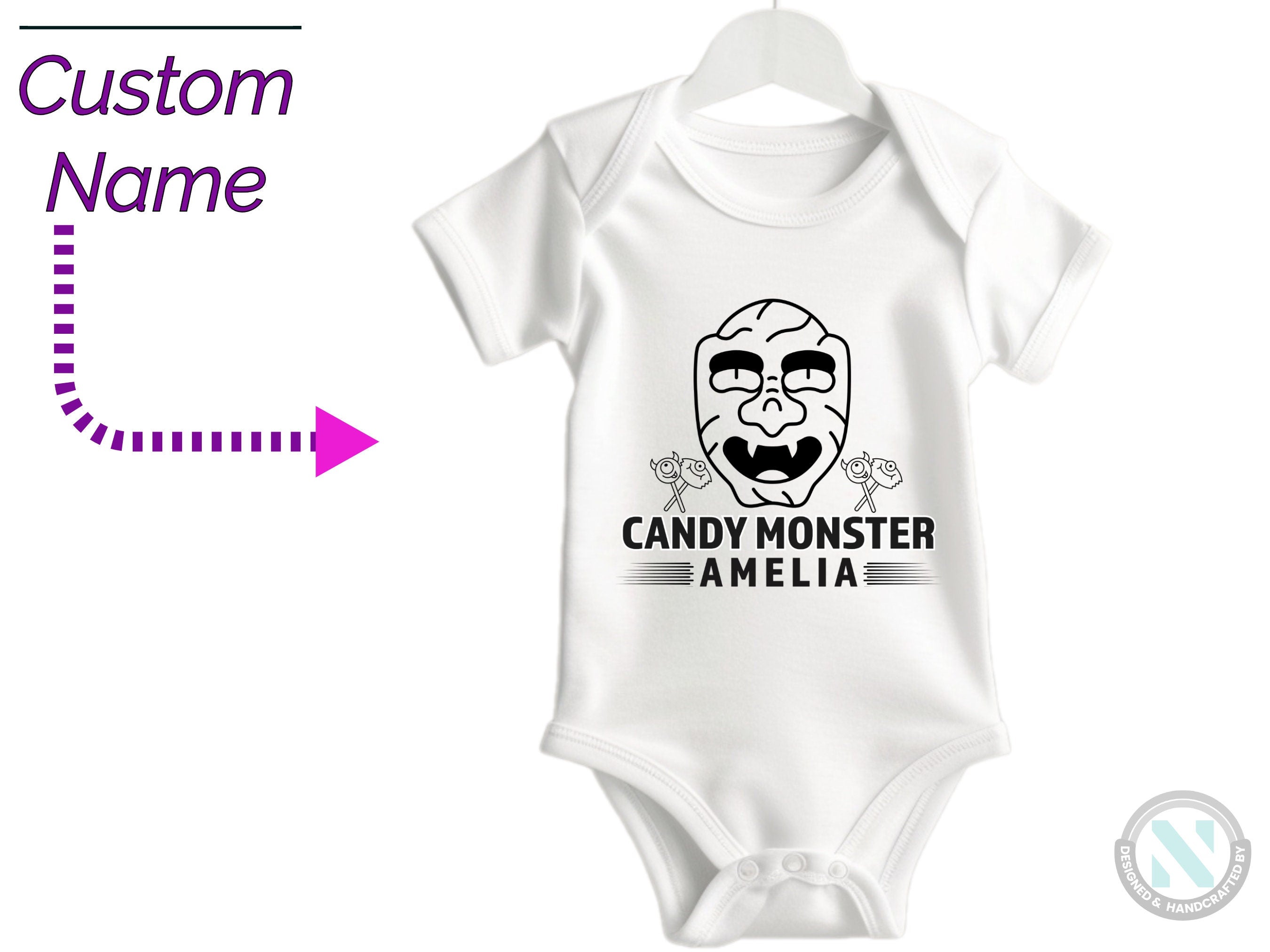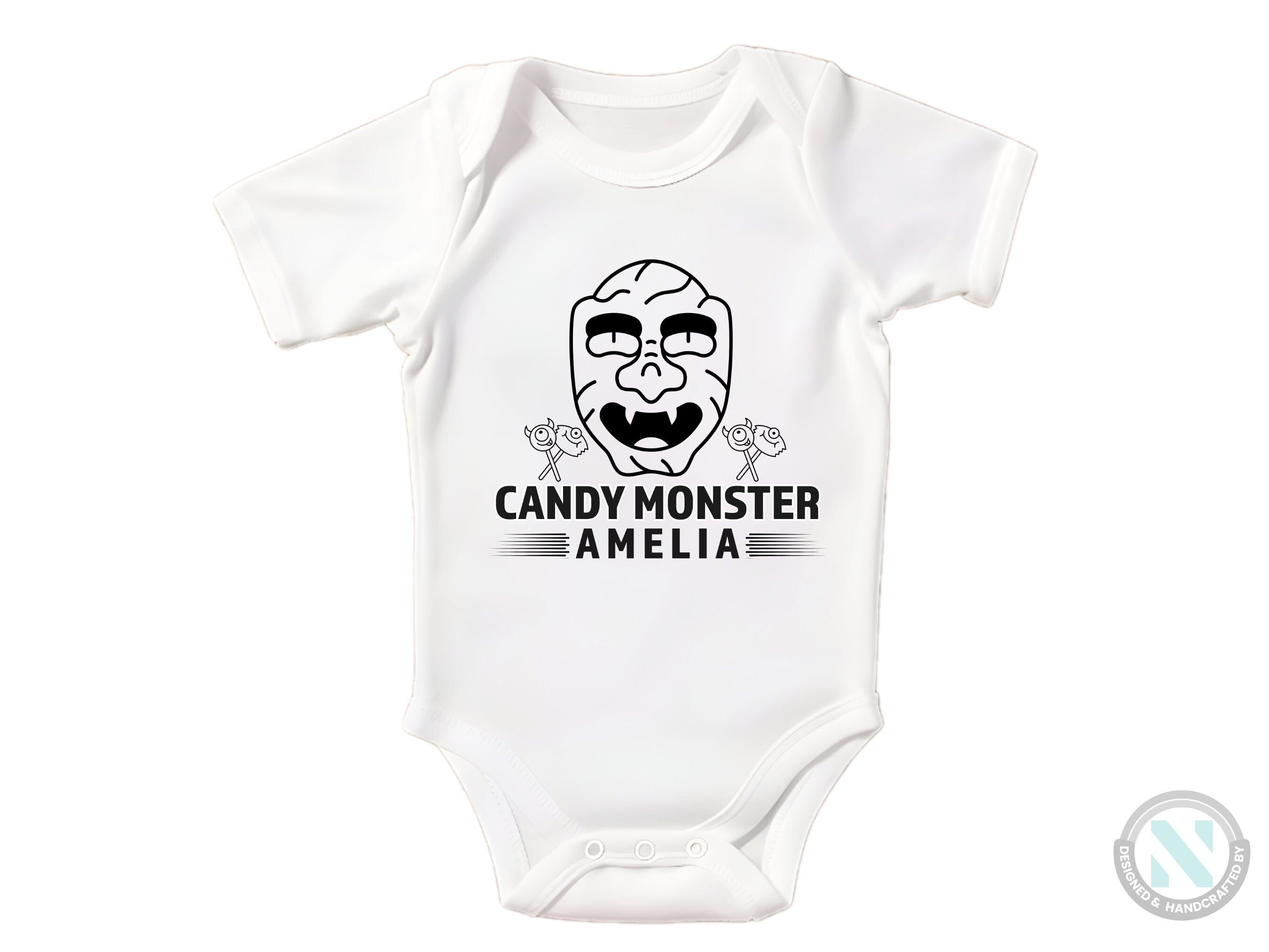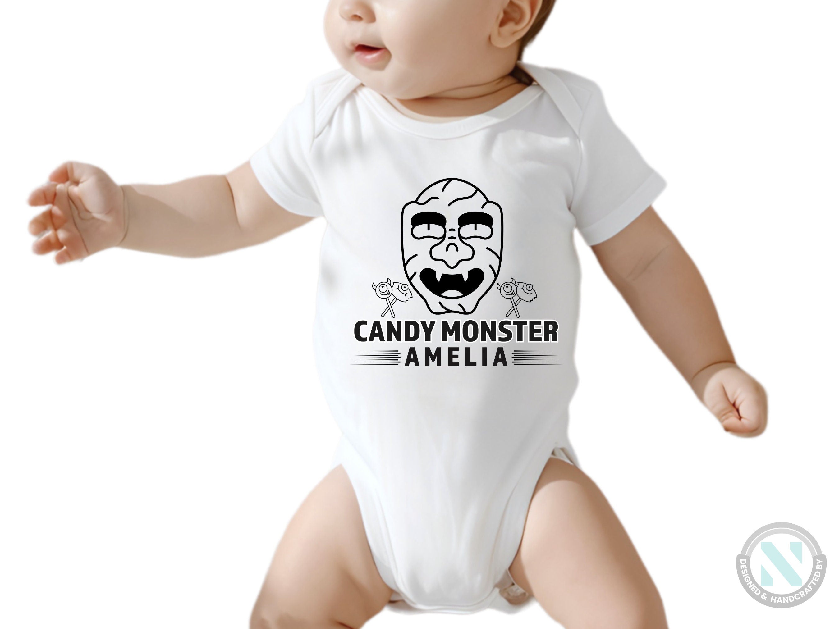 Halloween Personalize Baby Girl Name Bodysuit With Candy Monster