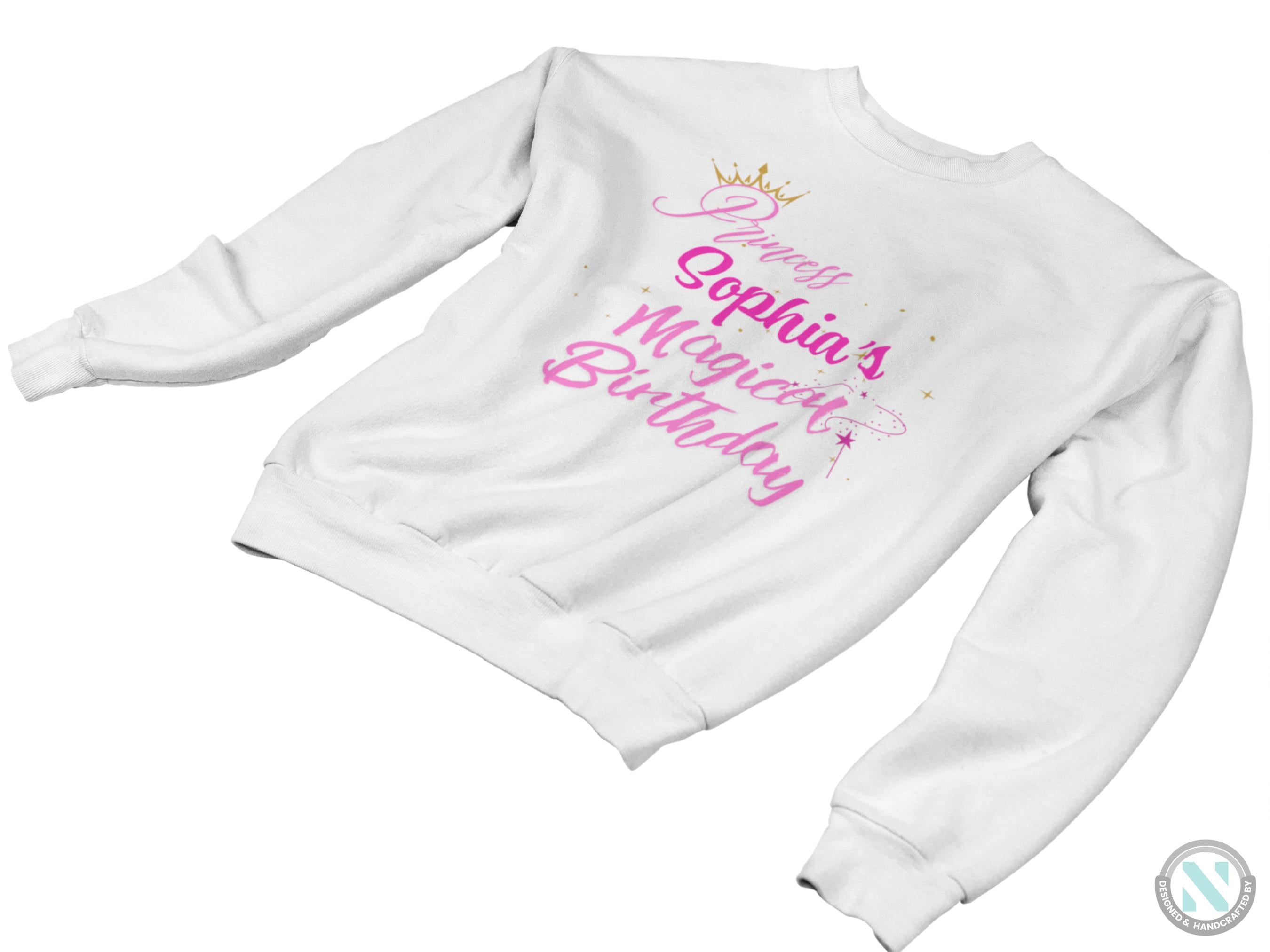 Crafted from soft, high-quality fabric, this sweatshirt ensures comfort and warmth during birthday festivities. The long sleeves provide cozy coverage, while the tailored fit allows for easy movement, ideal for enjoying birthday parties and playful activities with friends and family. Adorned with a whimsical "Princess Magical Birthday" design and vibrant colors, it adds a touch of fairy tale charm to her wardrobe, suitable for both special occasions and everyday wear.
