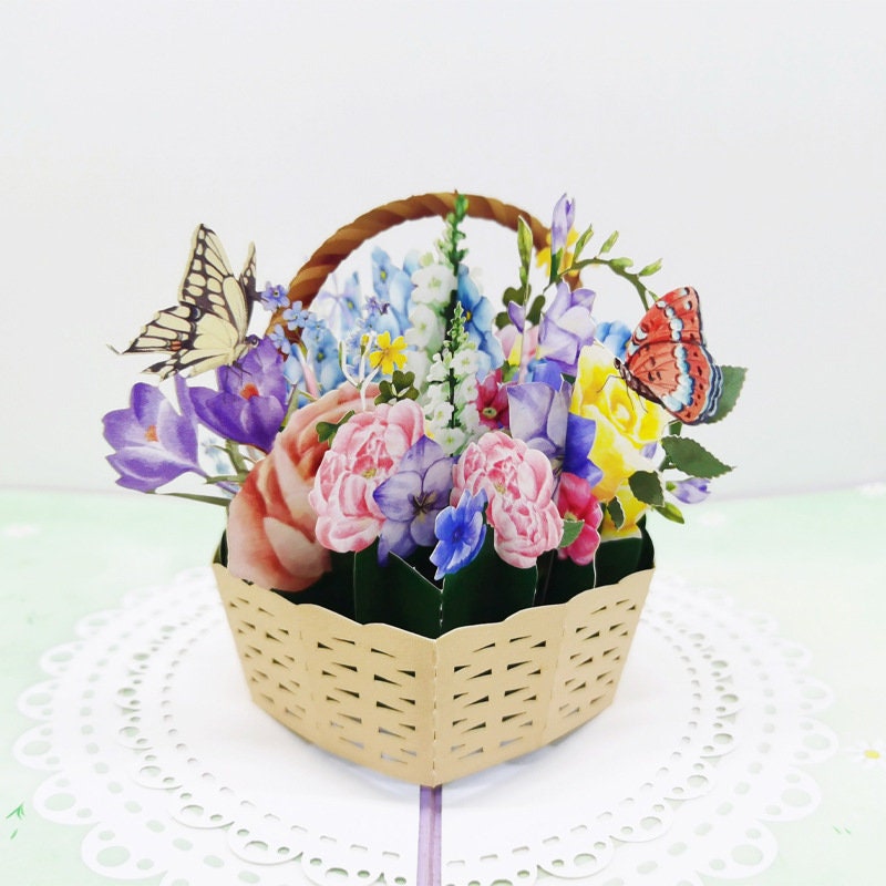Butterfly & Flowers Basket 3D Handmade Pop Up Greeting Card: Perfect for Thinking of You, Congrats, Happy Wedding, Mother day Birthday Thank