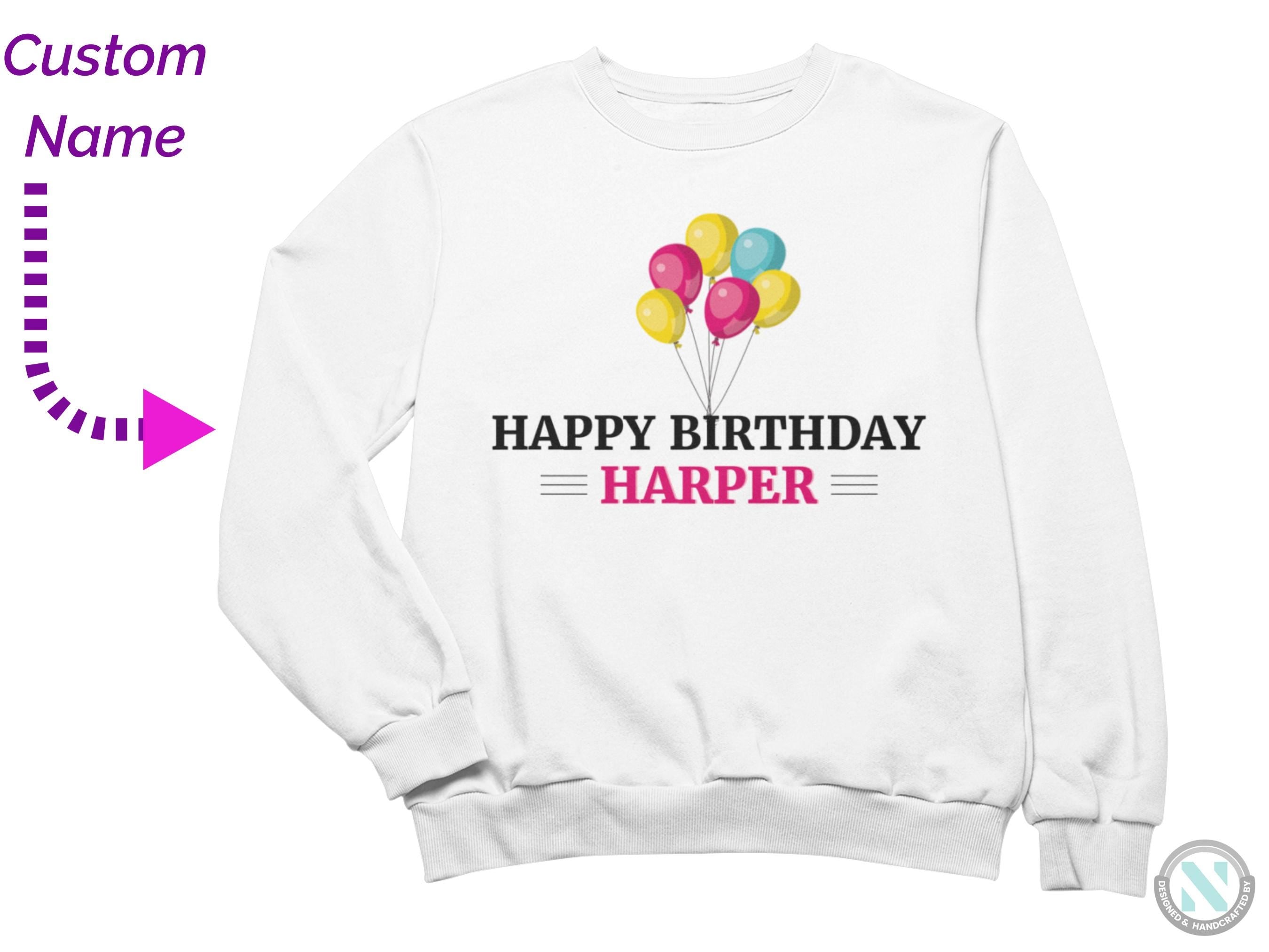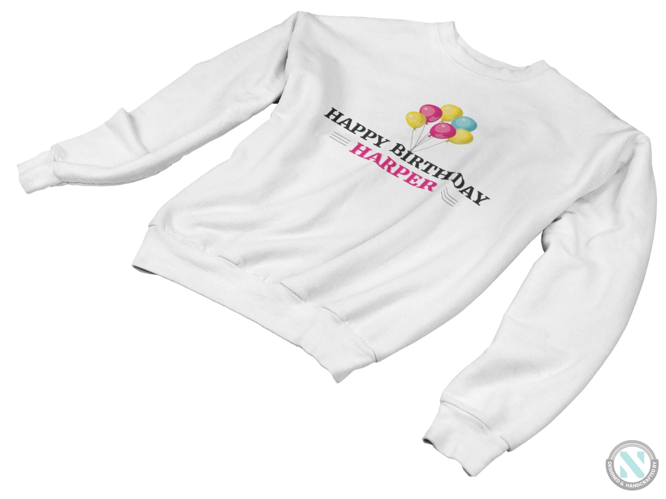 a white sweatshirt with the words happy birthday harper on it