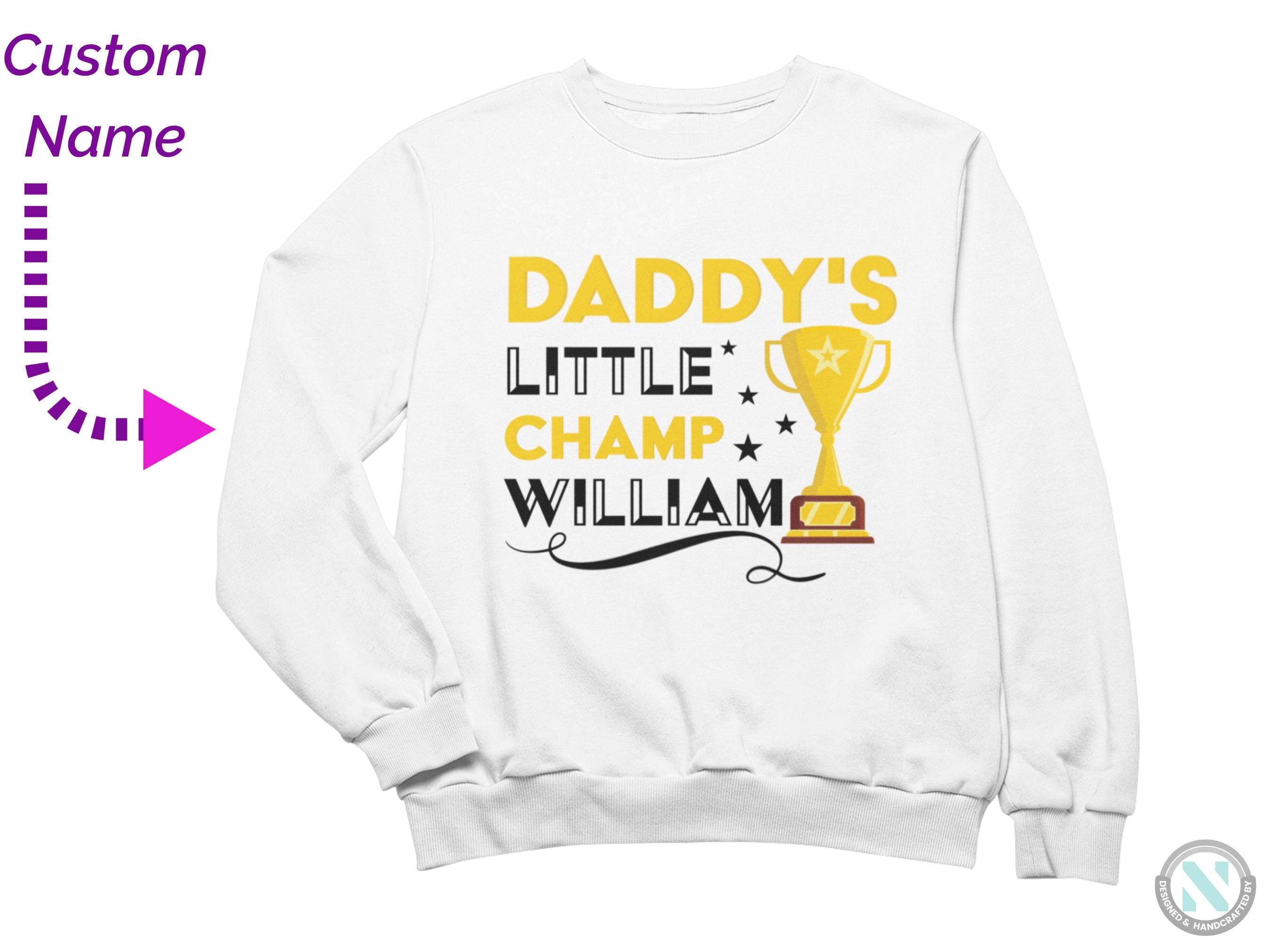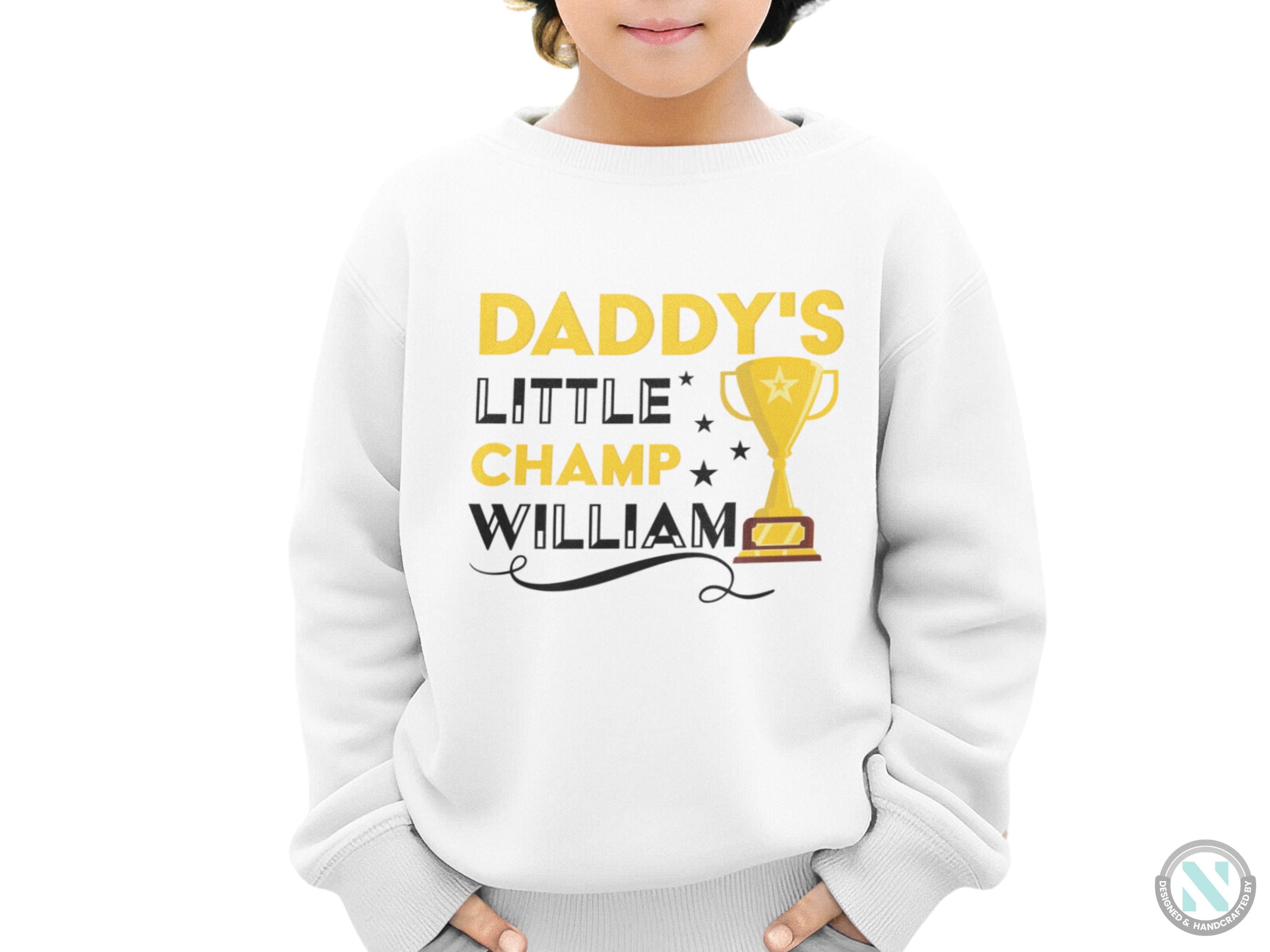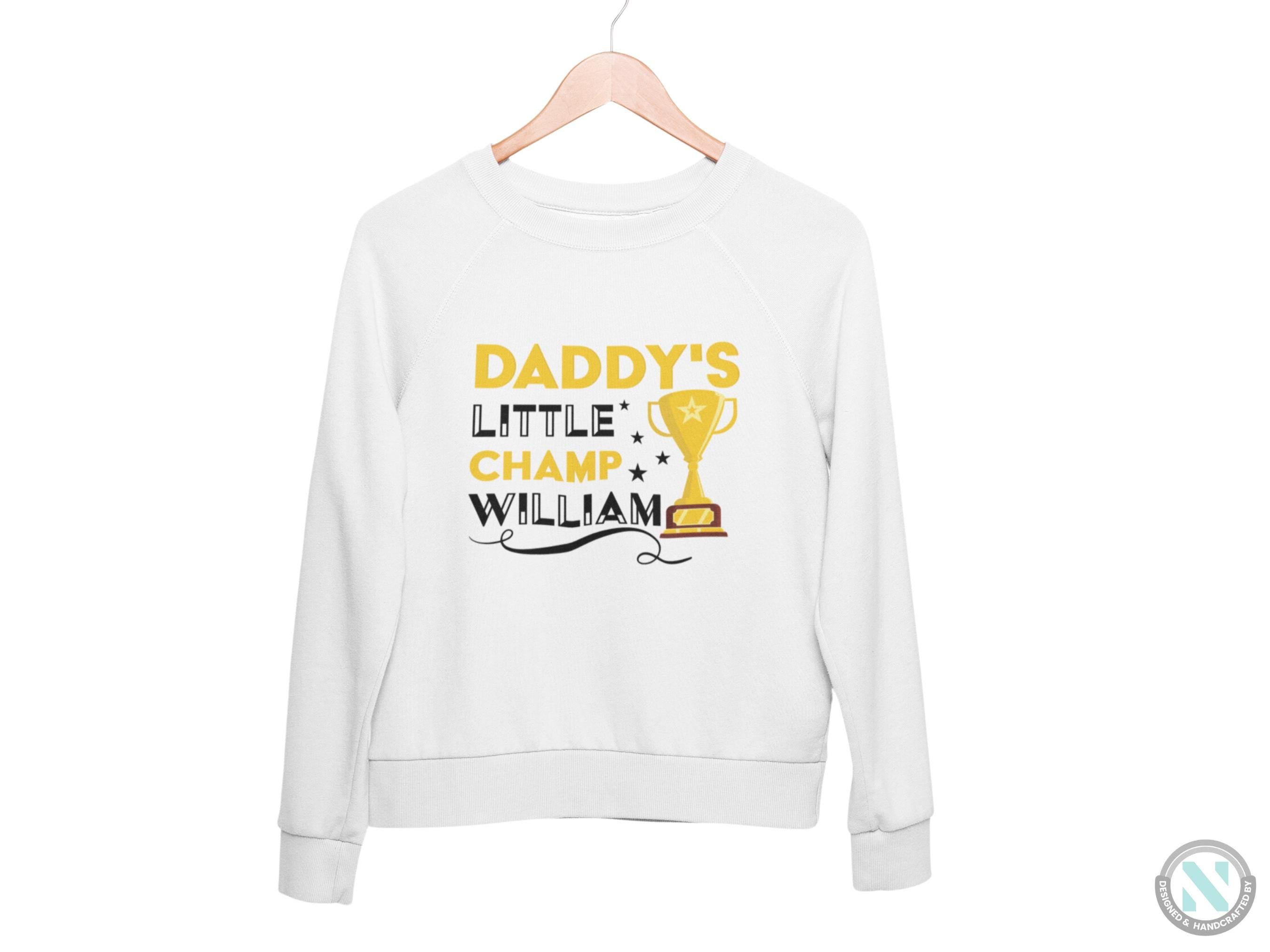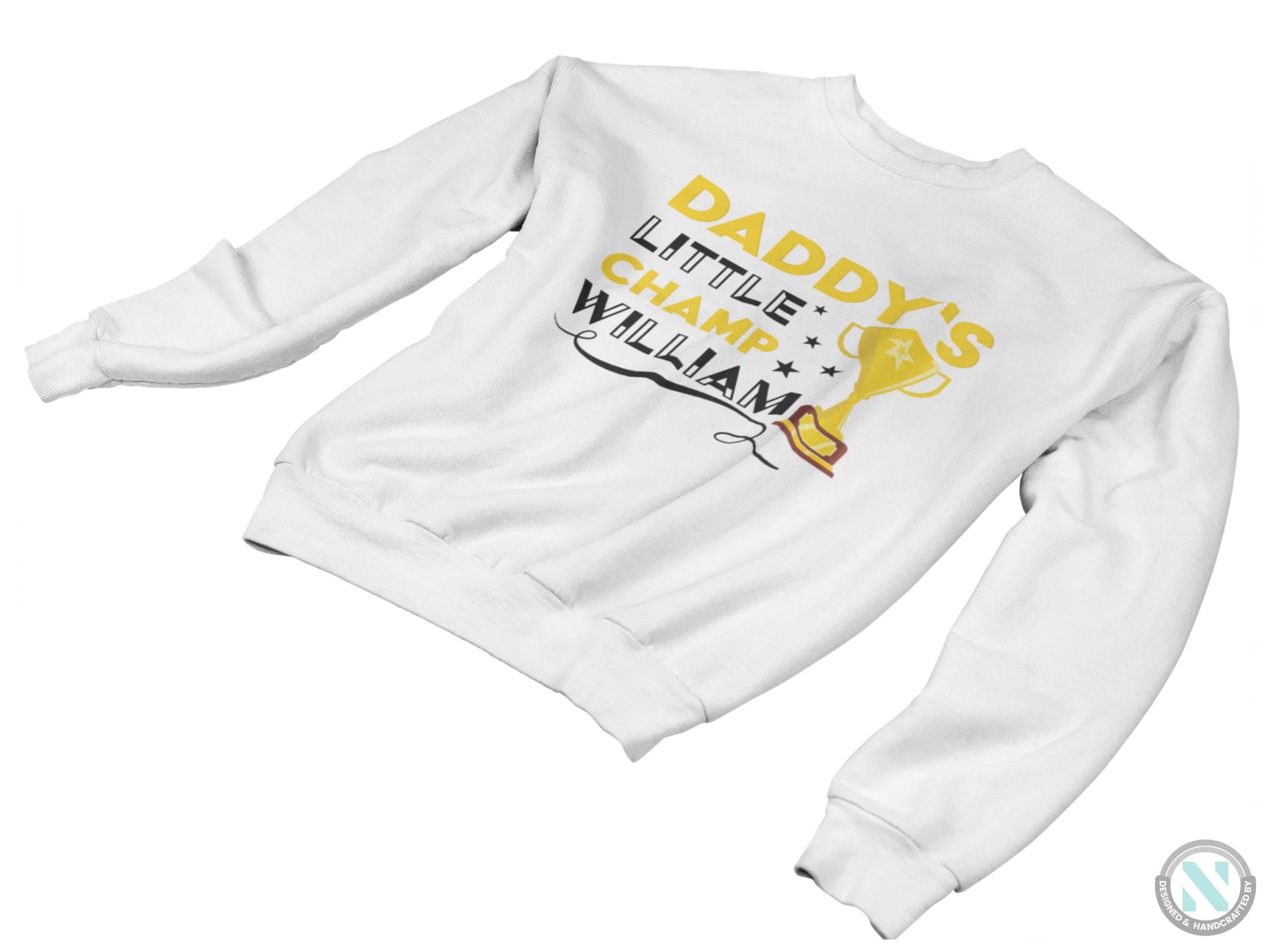 a white sweatshirt with the words daddy's little champ william on it
