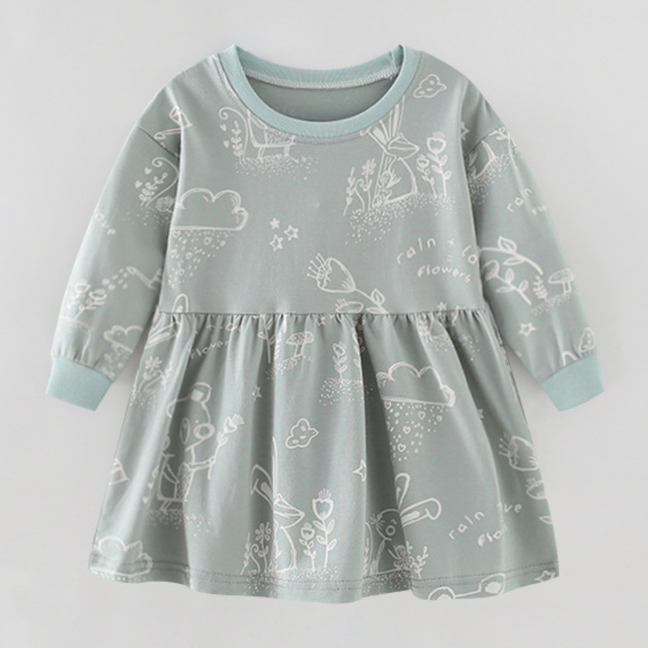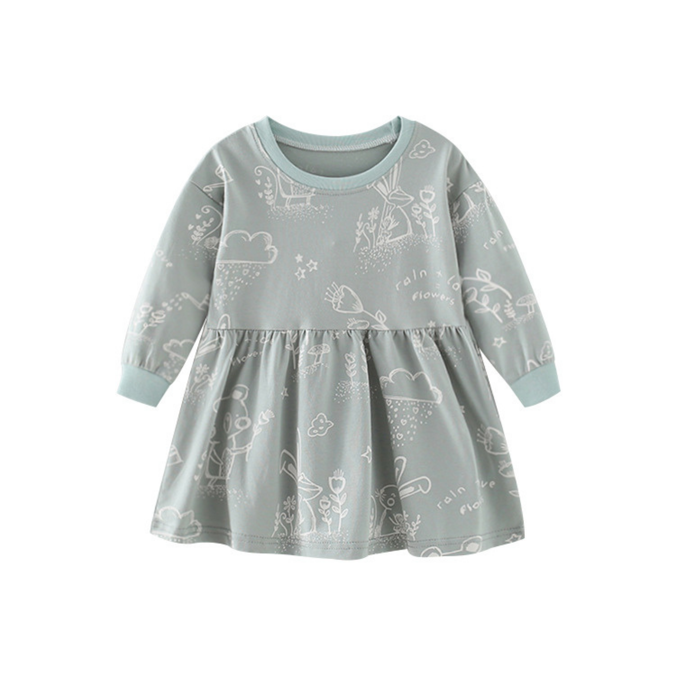 Full Sleeve Bunnies Print Theme Girls Dress, Grey