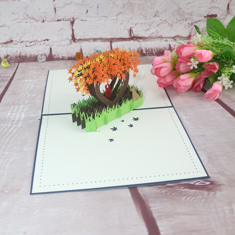 The card is crafted with care, ensuring that each one is unique and special. The pop-up design adds a fun and interactive element to the card, making it an extra special gift for someone special. The greeting card can be personalized with a personalized message, making it an even more meaningful and personal gesture. This thoughtful and heartfelt card is the perfect gift for her and is sure to be treasured for years to come. So, if you're looking for a way to make someone's day, this beautiful handmade 3D pop-up maple leaf forest love greeting card is a perfect choice.