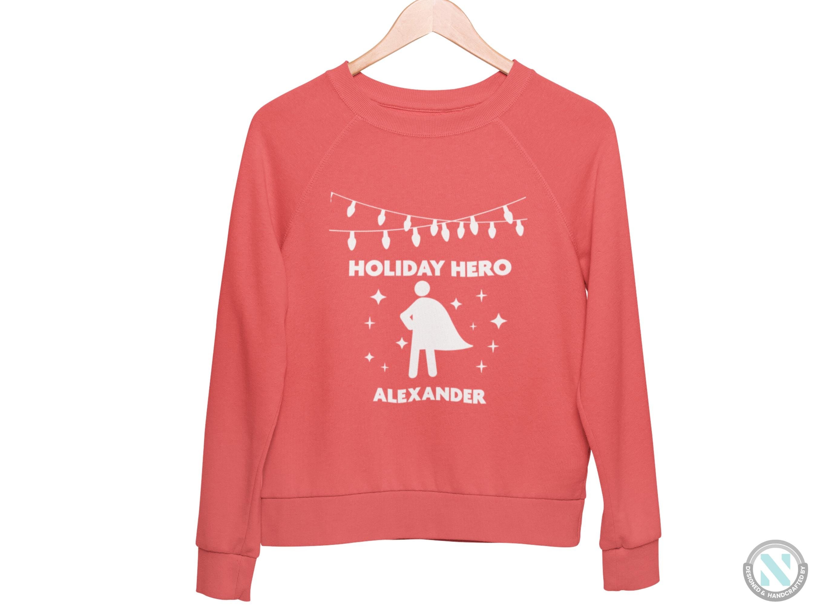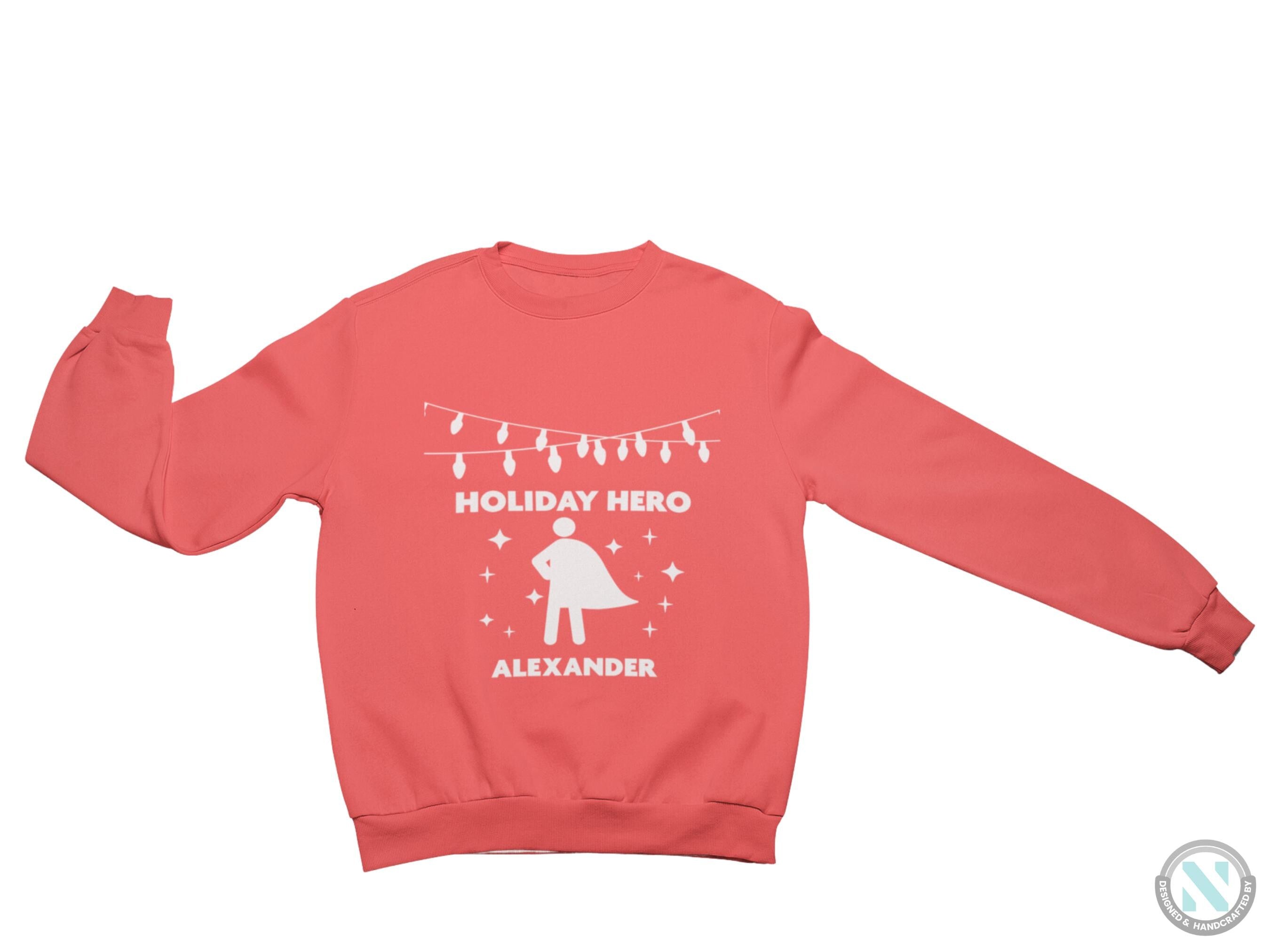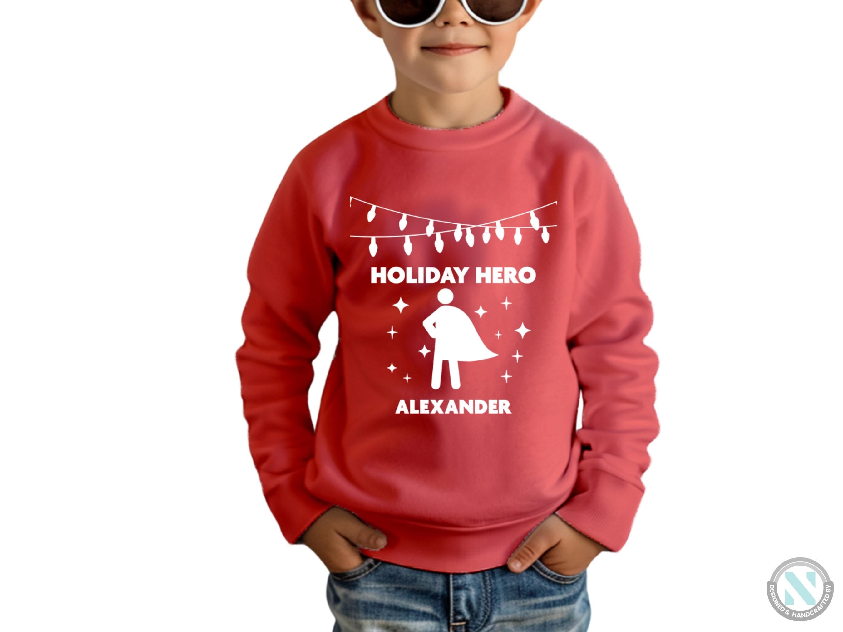 Celebrate your little one's heroic spirit this holiday season with the "Toddler Boys Custom Name Christmas Sweatshirt with Holiday Hero Text." This Personalized Jumperd winter sweatshirt is the perfect Christmas gift, designed to keep your toddler warm, stylish, and ready to take on all the festive fun.